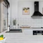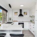 • Stylish kitchen featuring black fixtures, electric oven, range hood, dishwasher, black sink and breakfast bar
