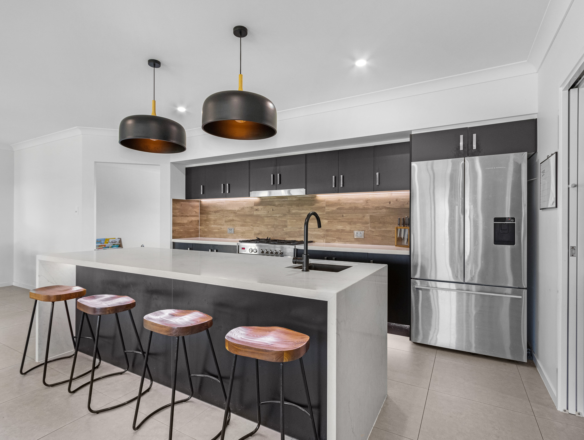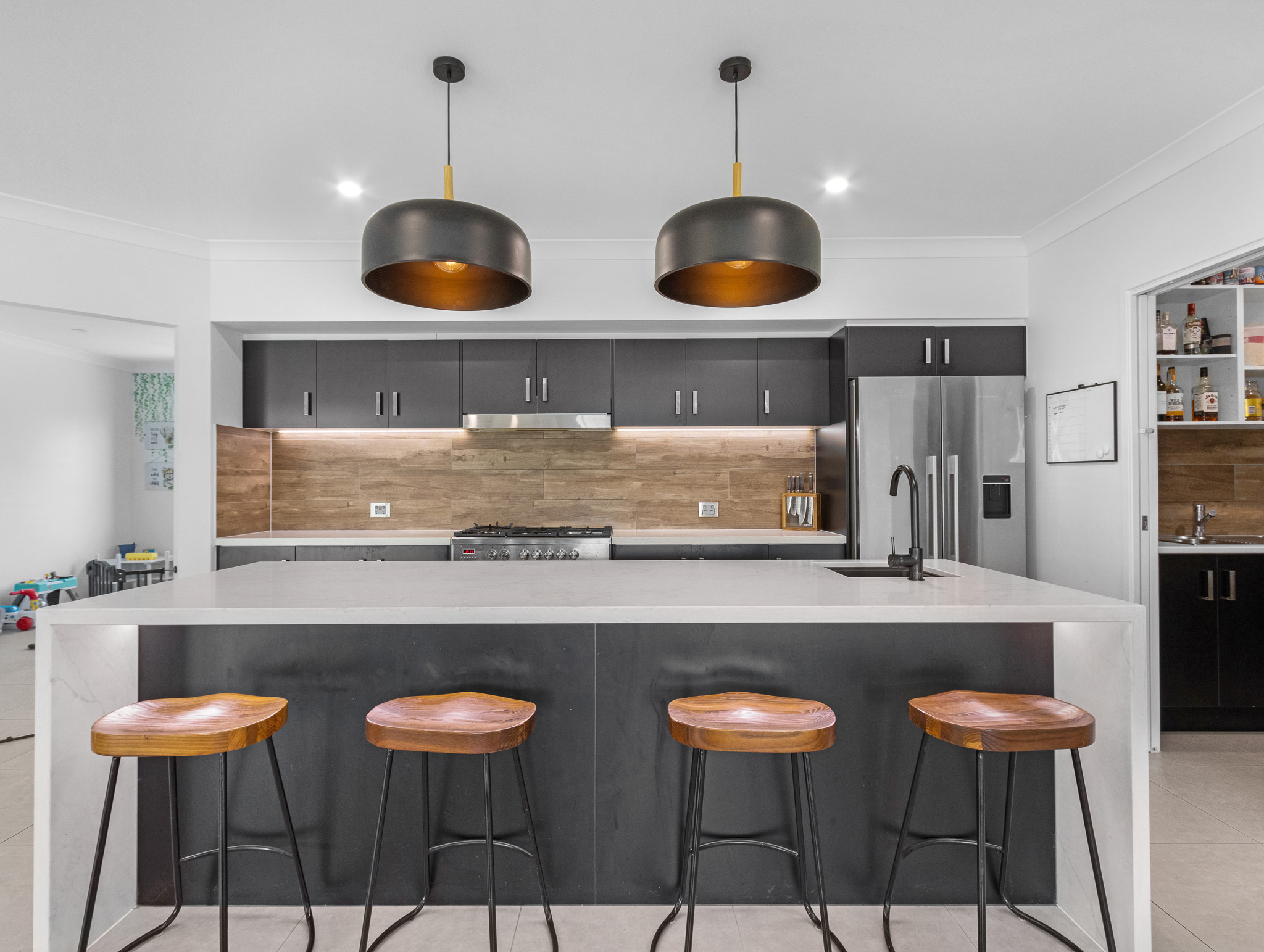 Step inside and be greeted by light-filled interiors, oversized living spaces, and thoughtful zoning for the whole family. At its heart, a striking open-plan kitchen, dining and living area flows seamlessly outdoors, creating the ultimate setting for relaxed entertaining. The gourmet kitchen is a chef’s dream, boasting high-end appliances, a large island bench, and a full butler’s pantry with abundant storage and prep space.